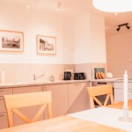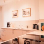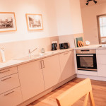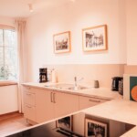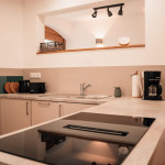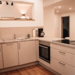 Grundausstattung vorhanden inklusive Elektrogeräte wie: Filterkaffeemaschine, Wasserkocher, Toaster, Eierkocher, Herd, Spülmaschine, Kühlschrank mit Gefrierfach